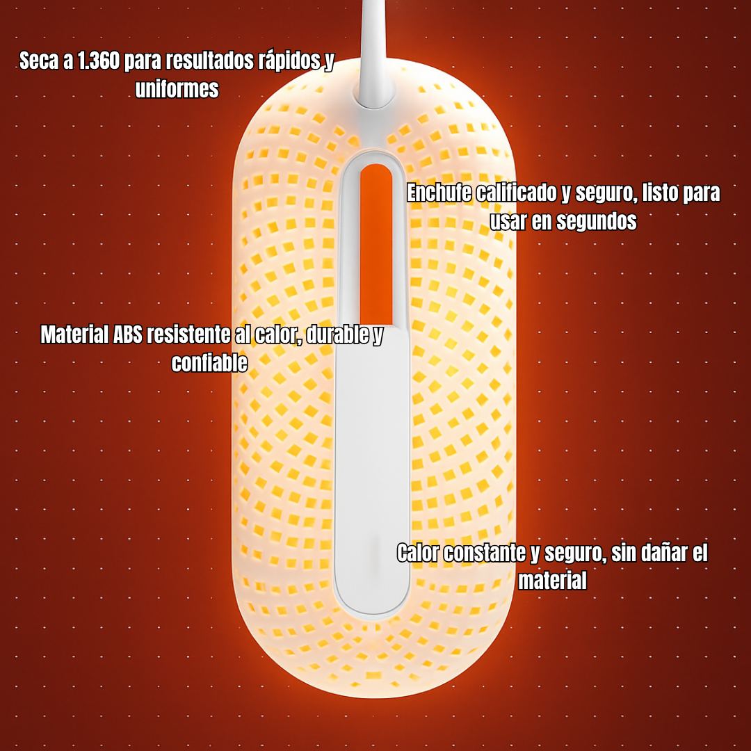 Este secador elimina la humedad desde el interior, sin deformar ni sobrecalentar. Ideal para trabajadores, deportistas, o familias que buscan practicidad y confort diario.
